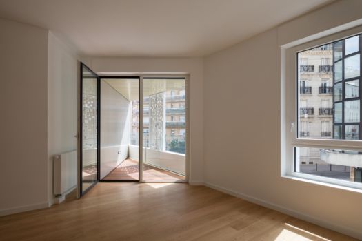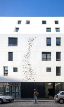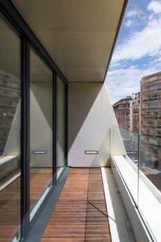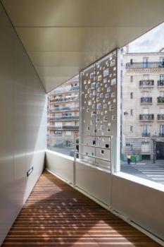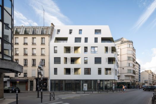 Cet ensemble s’exprime aussi par la finesse de ses matériaux, blancheur du Corian avec ses perforations variables et reflets dorés du métal. Le verre se transforme, tantôt miroir vers la rue et le ciel, tantôt transparence vers la lumière des appartements. Le soir, le bâtiment se teinte du bleu du ciel et du jaune des réverbères.