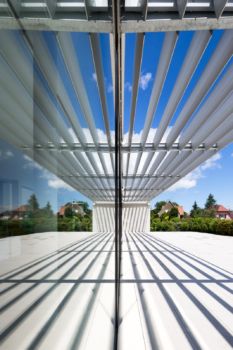 En s’approchant, l’édifice se découvre et révèle sa nature plurielle, mélange de patrimoine et d’architecture contemporaine. Son bâti principal témoigne de son passé, tandis que son extension, résolument moderne, donne la part belle à une écriture de béton et de verre. Ses pare-soleil blancs géométriques offrent des compositions graphiques, entre ombres et reflets.
