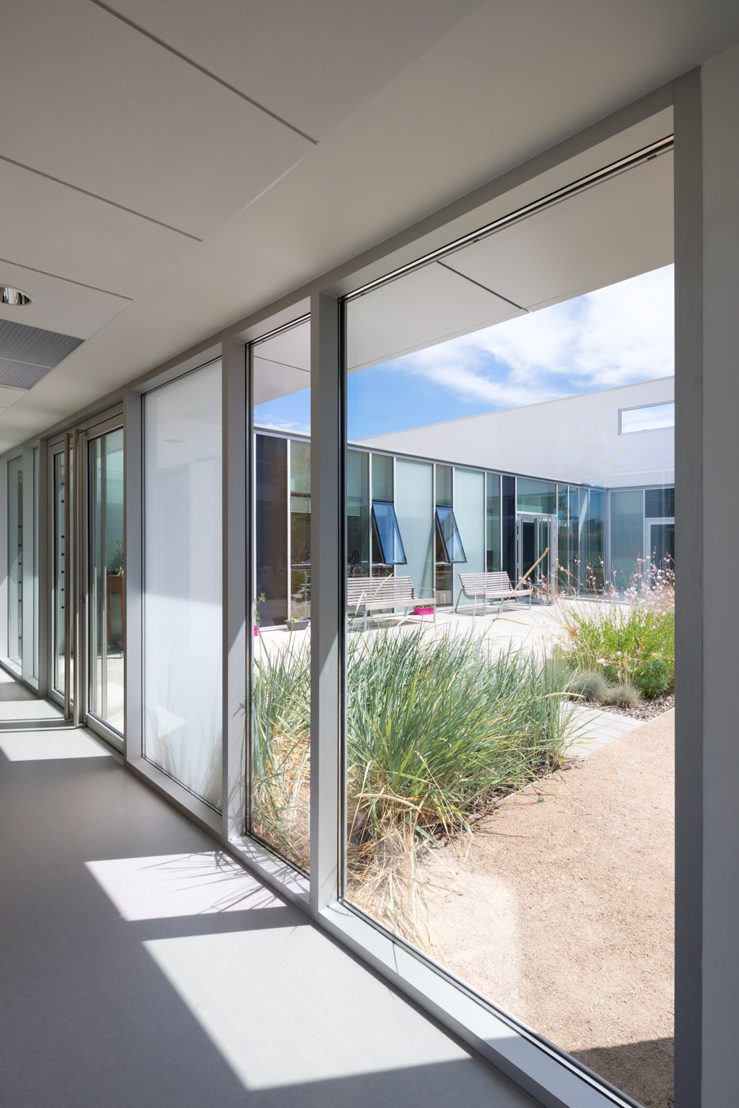 La géométrie de l’édifice est au service de cette relation, et de la fonctionnalité du bâtiment. Elle témoigne de l’imbrication des volumes, une horizontalité forte rythmée de verticalités ponctuelles.