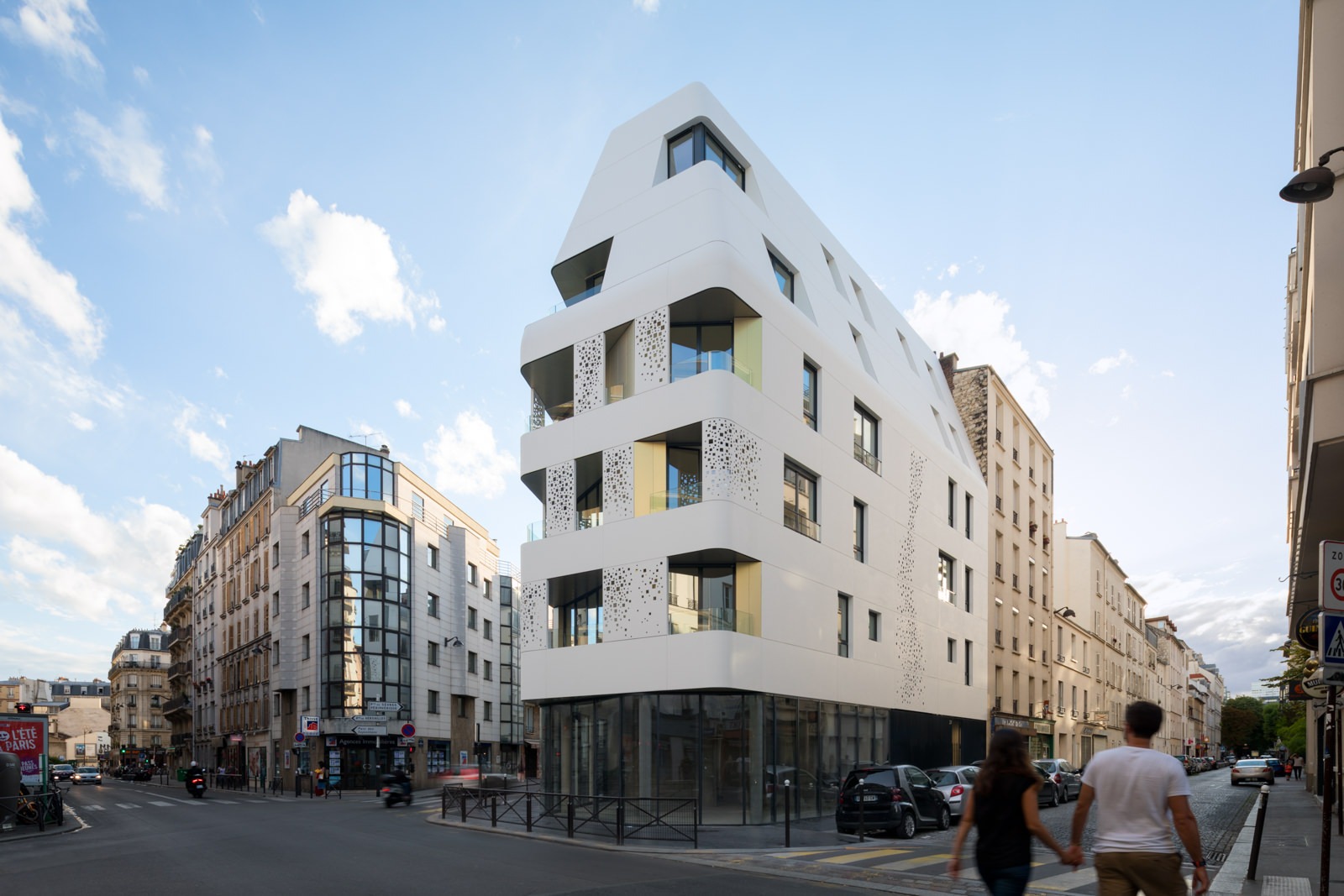Cet immeuble de 10 logements sociaux rue de la Croix-Nivert occupe une position singulière sur un carrefour. Il termine l’îlot et joue le rôle de l’articulation, avec ses angles arrondis et son attique qui se plie, s’adaptant à son contexte.