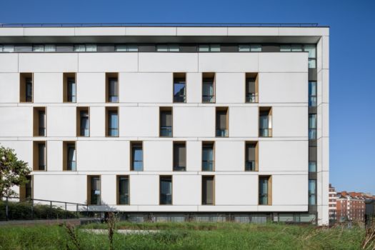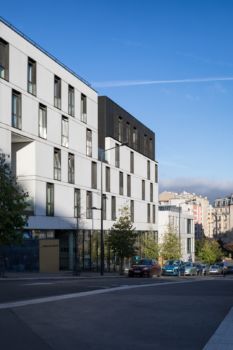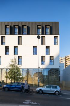 Le bâtiment conçu par Lazo & Mure utilise ces caractéristiques pour écrire un rapport au sol et au ciel, à travers l’usage de différentes matérialités. Le verre utilisé pour le socle donne de la légèreté à l’édifice en réfléchissant son environnement, le corps de bâti blanc contraste avec la toiture noire et donne une échelle urbaine à la construction.