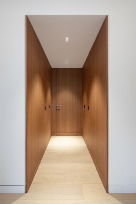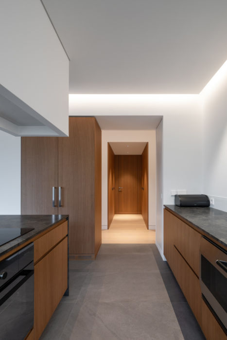 Le reportage photo doit pouvoir exprimer en quelques prises de vue l’essentiel des qualités architecturales du projet. Ici l’espace de desserte de l’entrée, avec son escalier, le couloir qui donne accès aux pièces de services, et le comptoir qui joue à la fois le rôle de transition vers la cuisine, et permet d’apporter la vue et la lumière dès le palier franchi.