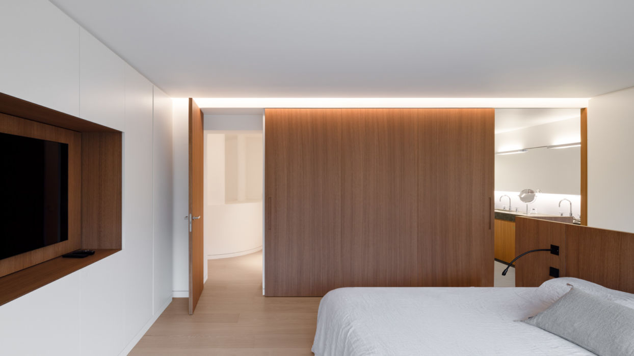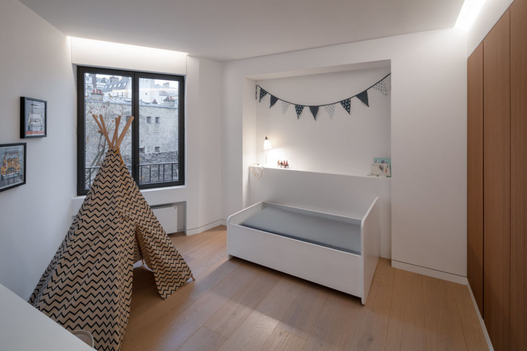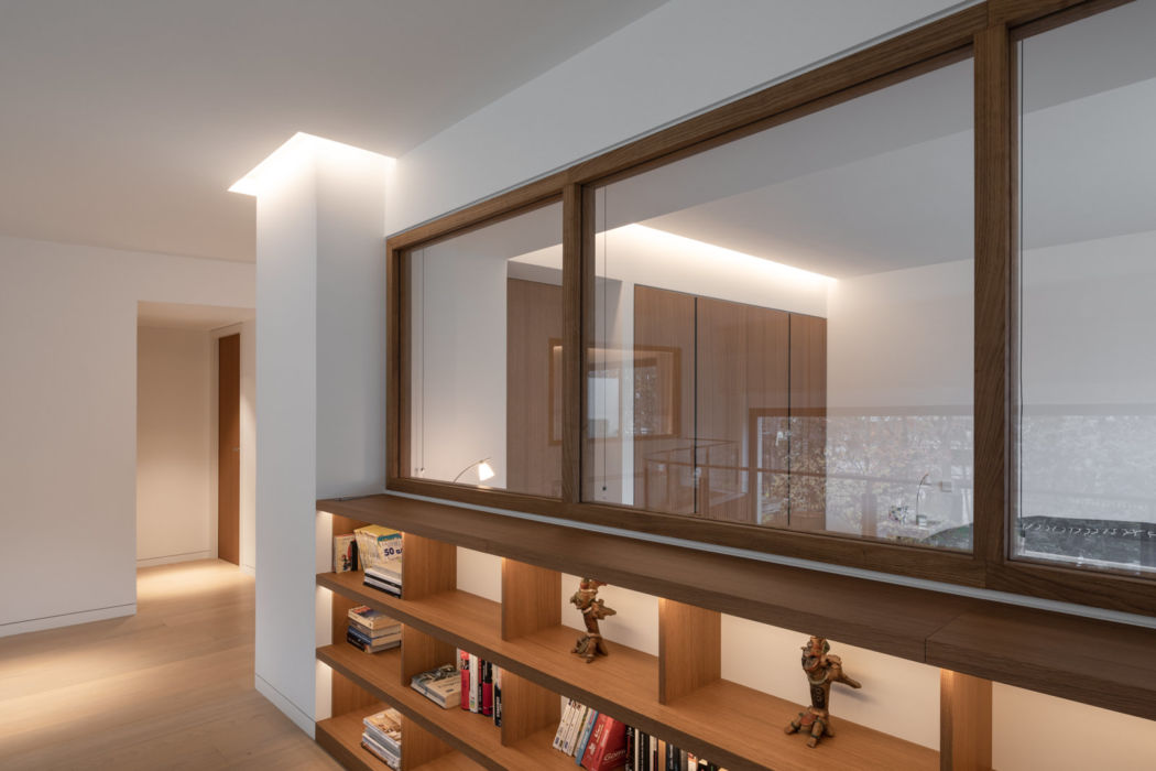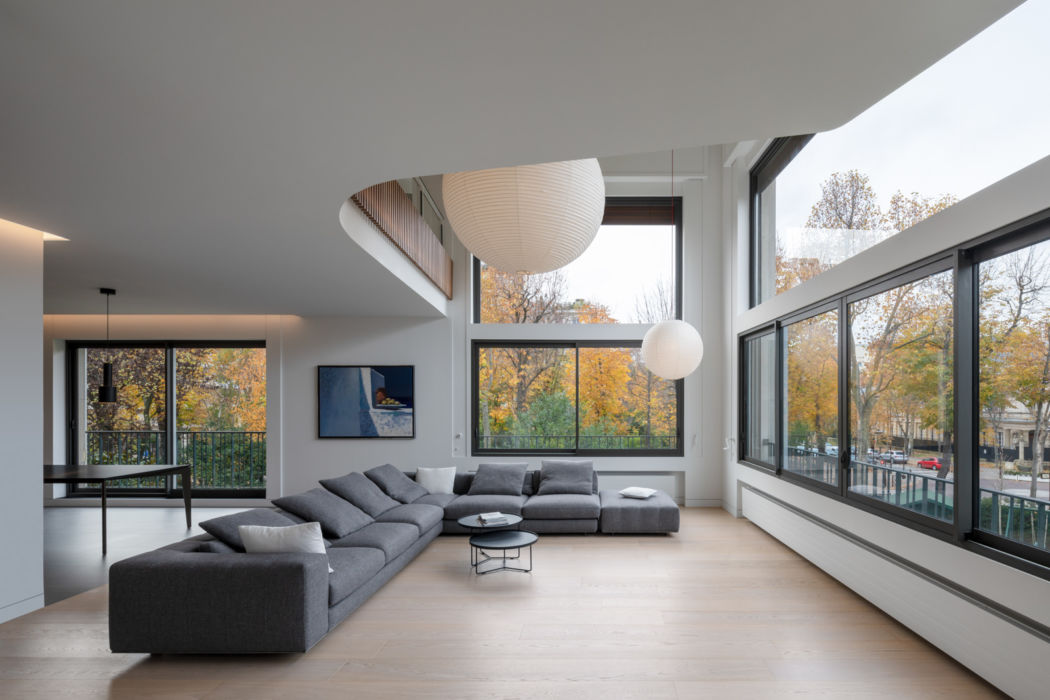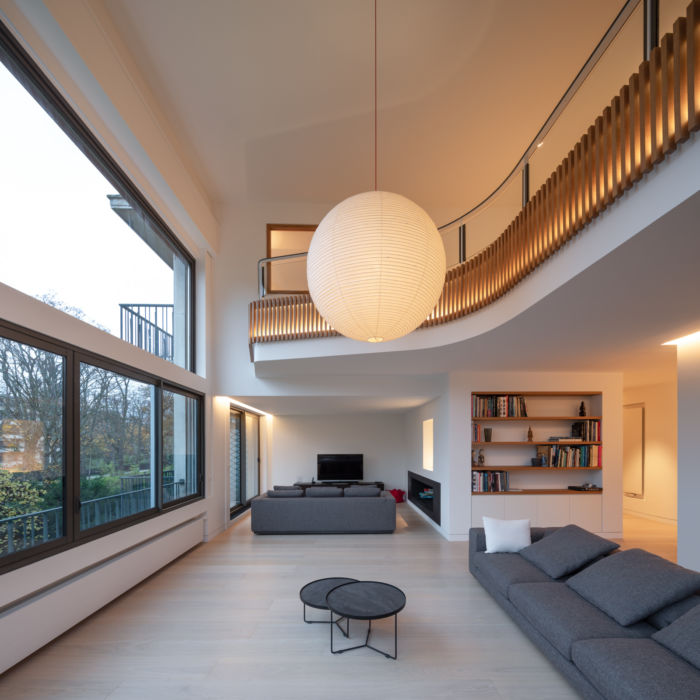 Dans cet appartement réhabilité par les architectes Brunnquell & André, règne une ambiance contemporaine et chaleureuse. Le choix de matériaux nobles et sobres, l’apport soigné de touches lumineuses et le travail sur les vues, vers l’intérieur et vers l’extérieur, combinent à créer un duplex luxueux agréable à vivre.