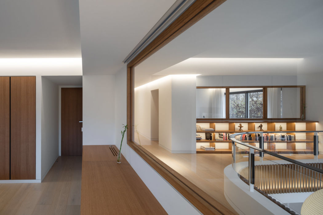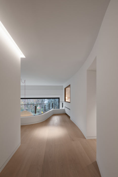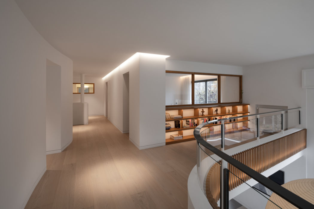 - Le couloir arrondi, à la fois desserte, balcon et espace de lecture avec sa bibliothèque